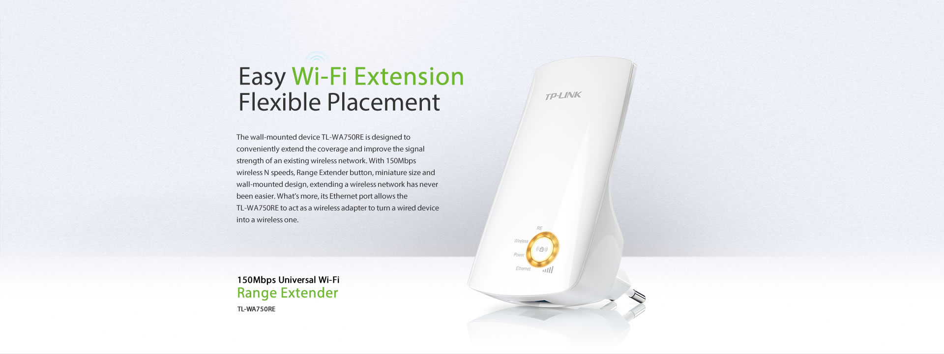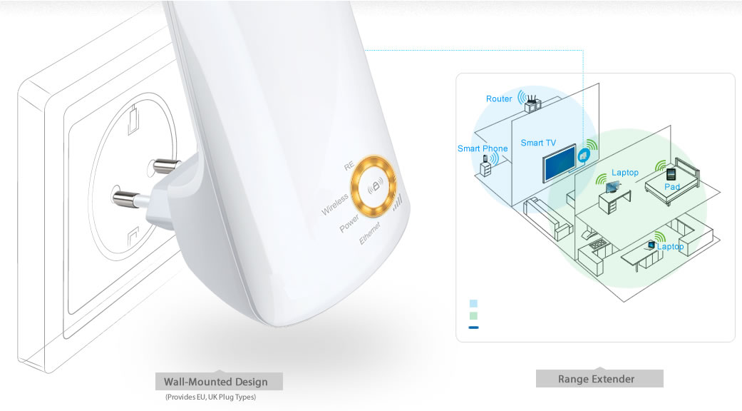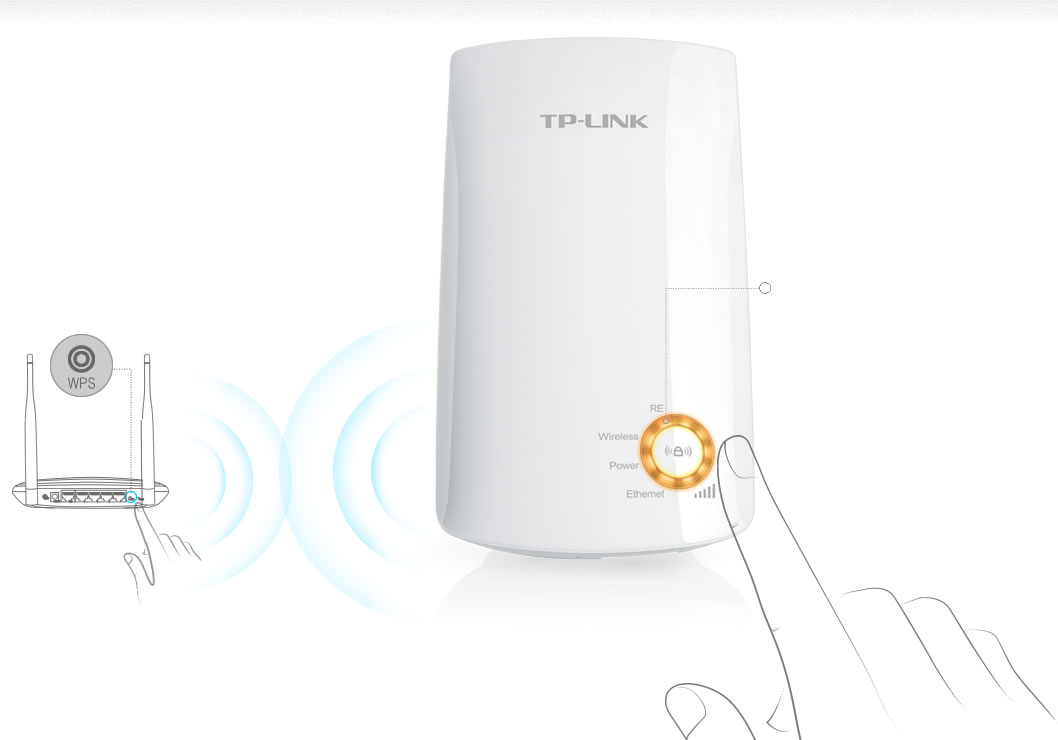 Không cần dây cắm, khi ở trong phạm vi phủ sóng của mạng không dây hiện hành, người dùng có thể dễ dàng mở rộng phạm vi phủ sóng chỉ bằng các nhấn nút WPS trên Router của mình, sau đó nhấn nút mở rộng sóng trên TL-WA750RE hoặc ngược lại. Thêm một lần nhấn nút ghép cặp có thể nhanh chóng thiết lập một kết nối bảo mật với thiết bị khách.
