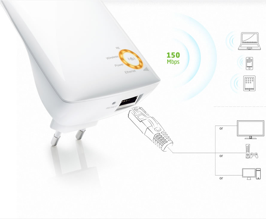 Cổng Ethernet trên TL-WA750RE cho phép thiết bị hoạt động như một bộ chuyển đổi không dây để kết nối các thiết bị có dây như máy nghe nhạc Blu-ray ®, chơi game console, DVR và TV Internet. Đồng thời, tại cùng thời điểm thiết bị có thể chia sẻ mạng không dây.