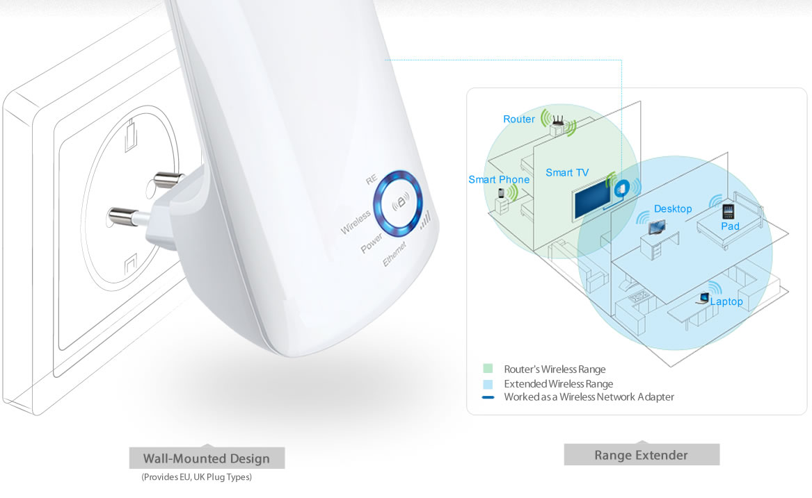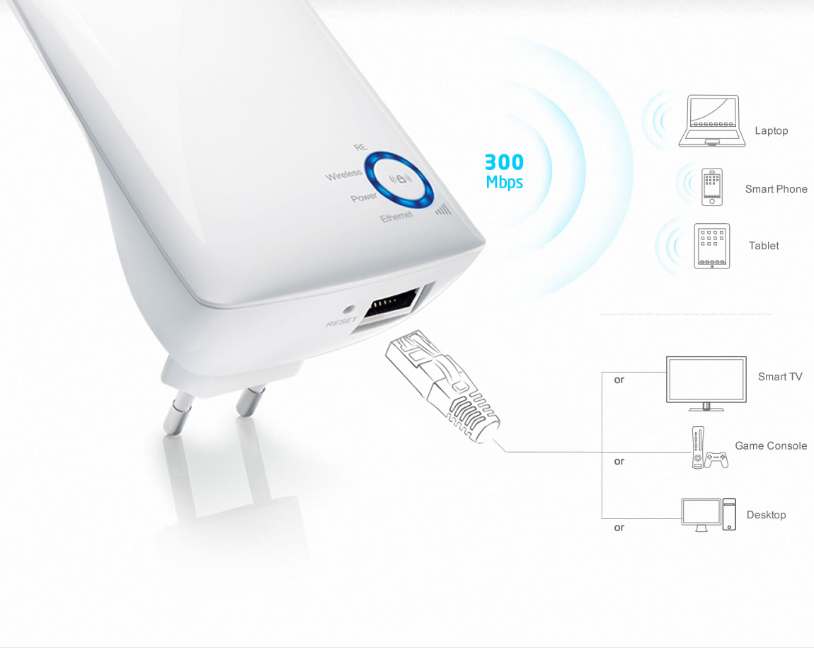 Cổng Ethernet trên TL-WA850RE cho phép thiết bị hoạt động như một bộ chuyển đổi không dâyđể kết nối các thiết bị có dây như máy nghe nhạc Blu-ray ®, chơi game console, DVR và TV Internet. Đồng thời, tại cùng thời điểm thiết bị có thể chia sẻ mạng không dây.