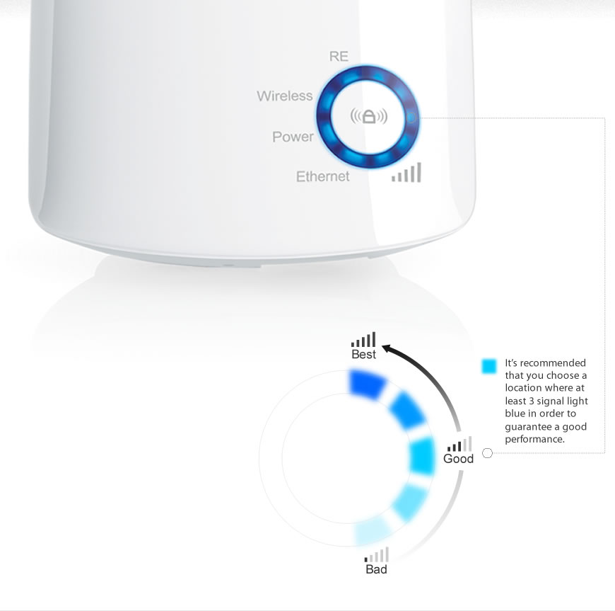 5 đèn tín hiệu báo hiệu cường độ sóng hiện tại mà TL-WA850RE nhận được từ Router hiện hành, giúp việc xác định vị trí đặt bộ mở rộng sóng để TL-WA850RE có thể đạt được khoảng cách và hiệu suất tốt nhất có thể.