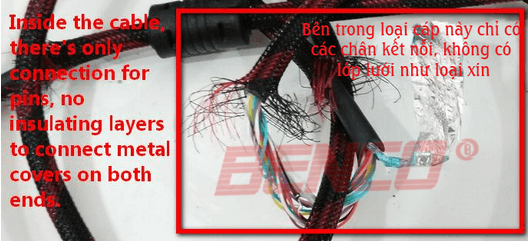 Dây cáp không đảm bảo chất lượng: Bên trong dây cáp không có vỏ kim loại dạng lưới kết nối hai đầu.