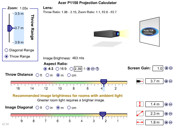- Như ở máy chiếu tôi thử bên trên ACER P1150 thì khoảng cách lý tưởng như hình các bạn có thể thấy đó là 3,7m